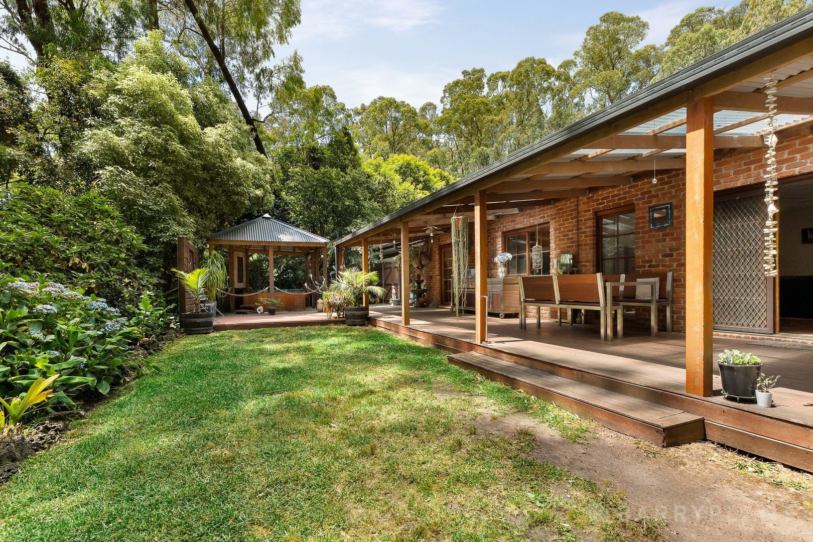 The kitchen features timber cabinetry, ample bench space, and a functional layout that connects seamlessly with the meals area and outdoor zones, making everyday living and entertaining easy. A covered deck and adjoining patio extend the living space outdoors, creating sheltered areas for year-round use, while the 10 person outdoor spa adds a private space to relax and unwind at the end of the day.