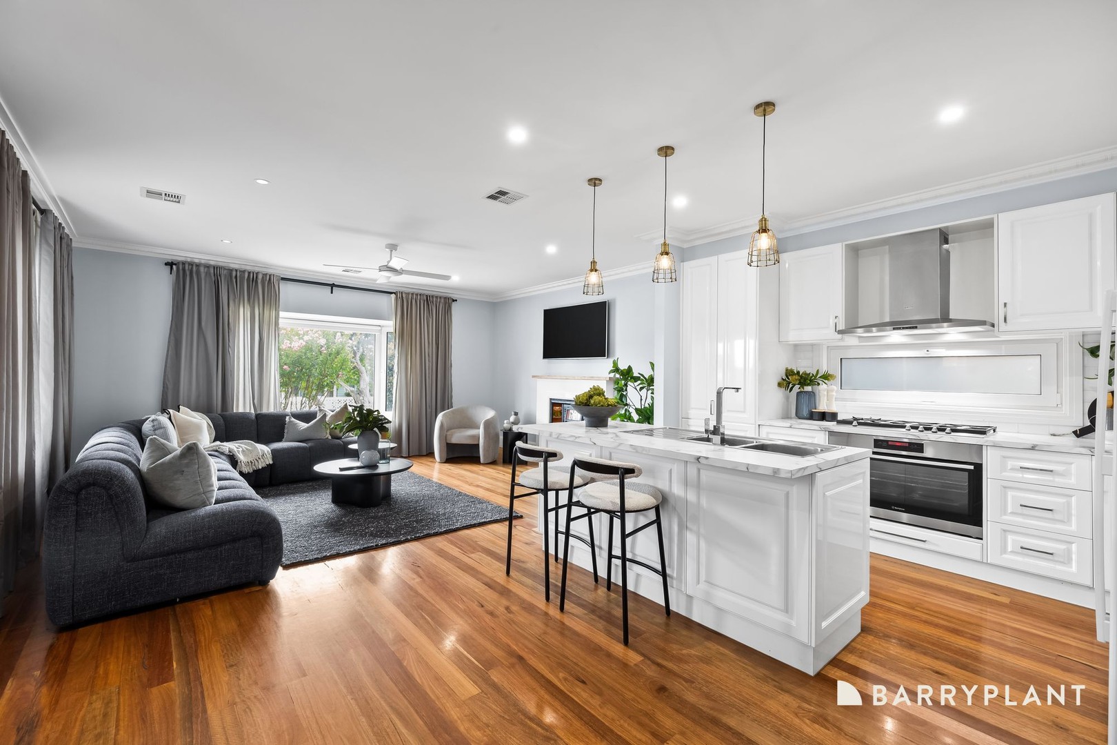 Step inside to discover a welcoming open-plan lounge, beautifully enhanced by a charming bay window and feature fireplace a cosy space to relax and unwind. Adjacent, the bright modern kitchen is equipped with stainless steel appliances and excellent storage, flowing seamlessly into a generous dining zone that comfortably accommodates eight or more guests, making entertaining effortless.