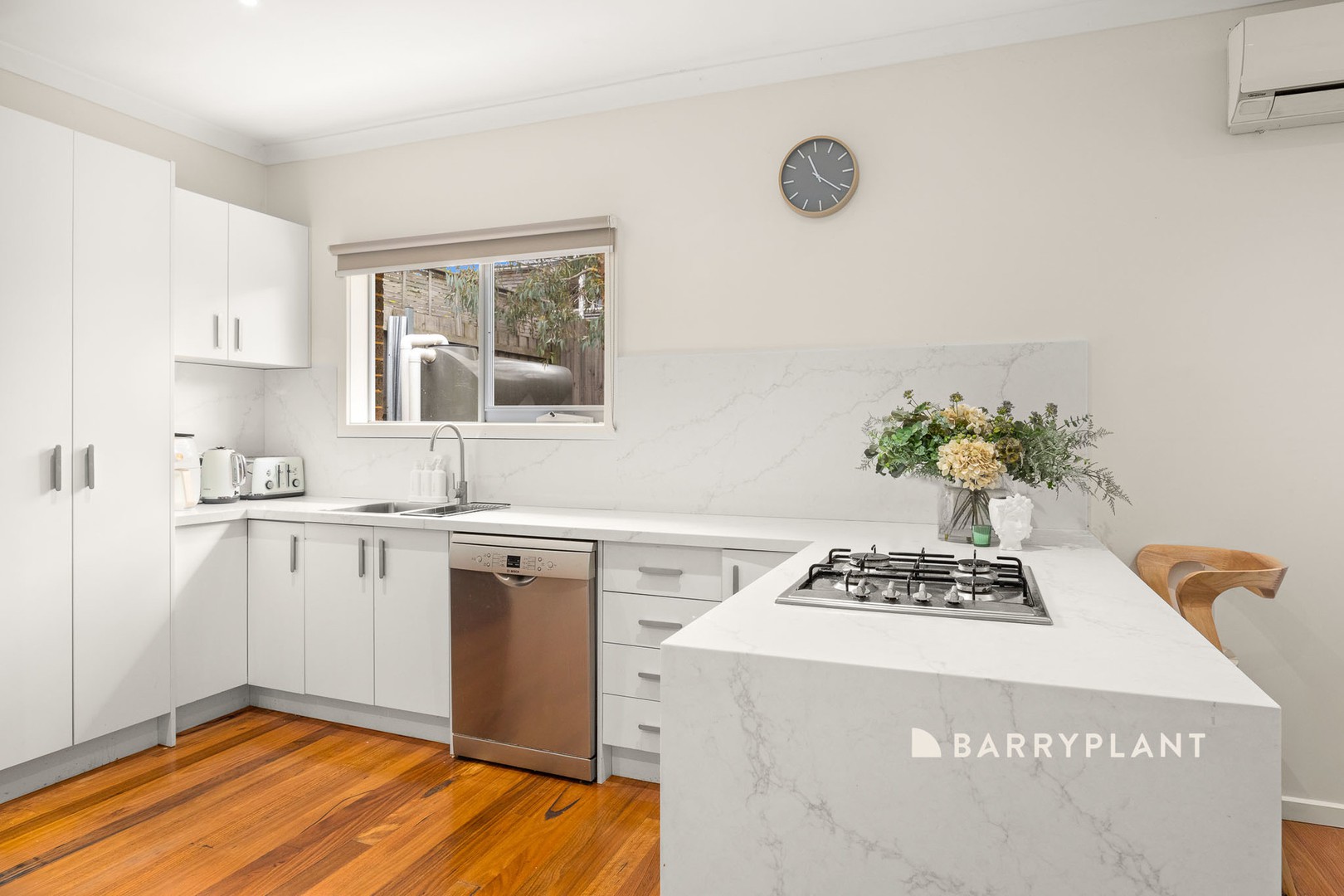 The heart of the home unfolds across an expansive open-plan living, dining and kitchen domain, where high ceilings and rich hardwood flooring create an immediate sense of scale and warmth. The kitchen is a true centrepiece, anchored by prestige polished Marbella stone benchtops designed to impress, complemented by sleek white cabinetry, stainless steel appliances, a gas cooktop and dishwasher. This space flows effortlessly through to a private, low-maintenance courtyard complete with a covered deck, creating a seamless indoor–outdoor connection ideal for relaxed mornings or elegant evening entertaining.
