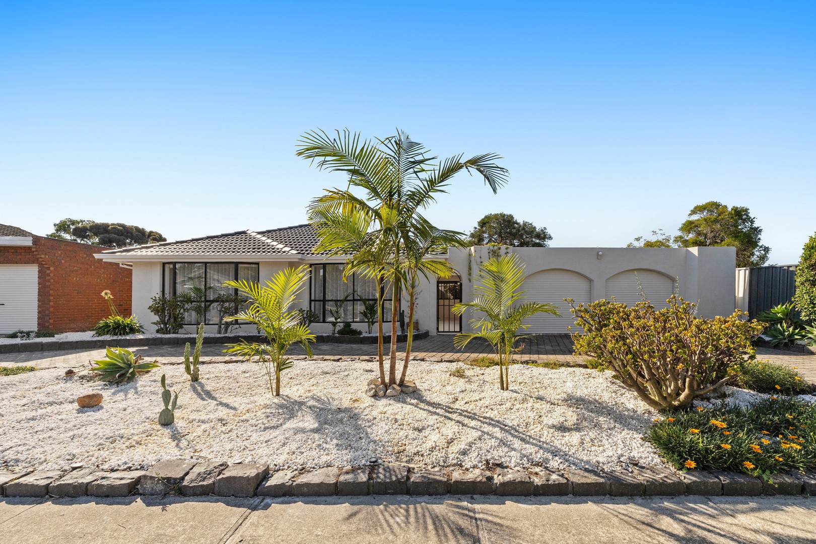 From the moment you arrive, the home sets a tone of understated luxury. A beautifully landscaped coastal garden, framed by pebbled textures, sculptural cacti, olive trees and soft greenery, creates a tranquil introduction - while the striking façade and arched detailing hint at the refined design that awaits inside.