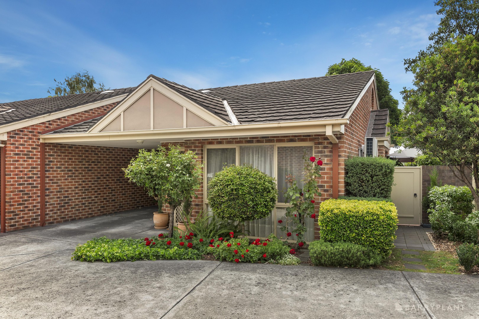 The home comprises two generous bedrooms with built-in robes, serviced by a central bathroom and separate laundry, with soft carpeting underfoot. Additional features include high ceilings, double blinds, split system heating and cooling, an undercover carport, a neatly maintained front garden, and a large garden shed for additional storage. Also included in the sale is a selection of outdoor furniture, pots, plants, and white goods.