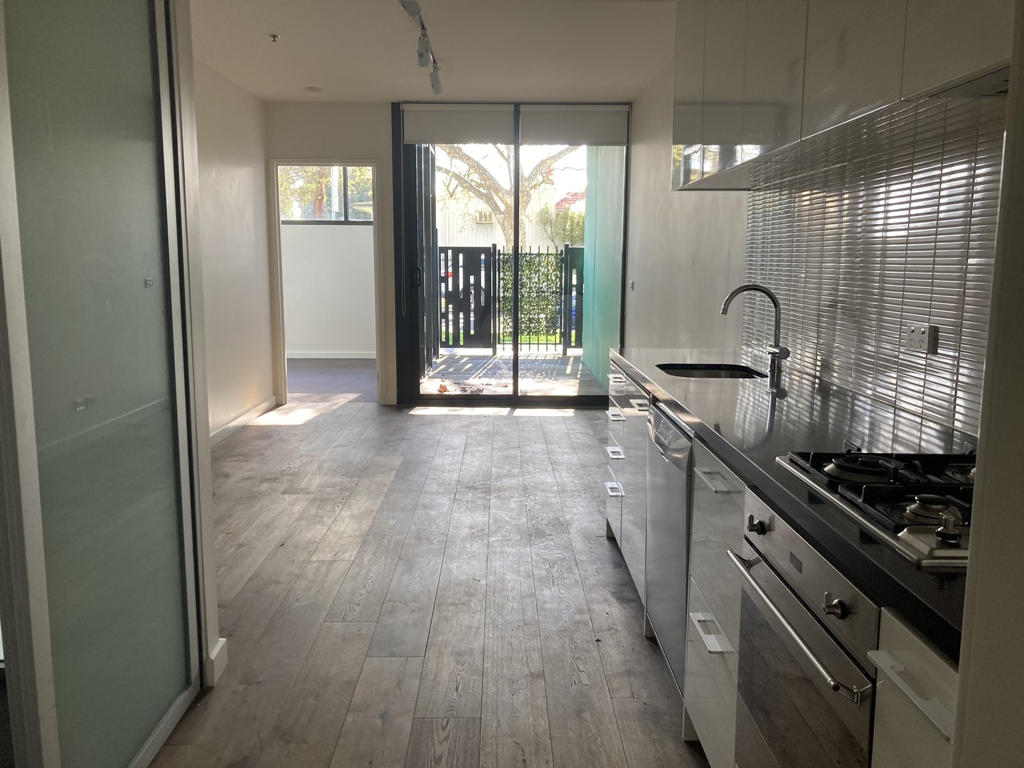 The open plan living zone fitted with stylish floorboards, leads to a practical undercover balcony that can be used year round. Modern kitchen features stainless steel appliances, gas cooking, glass splashbacks and stone benchtops.