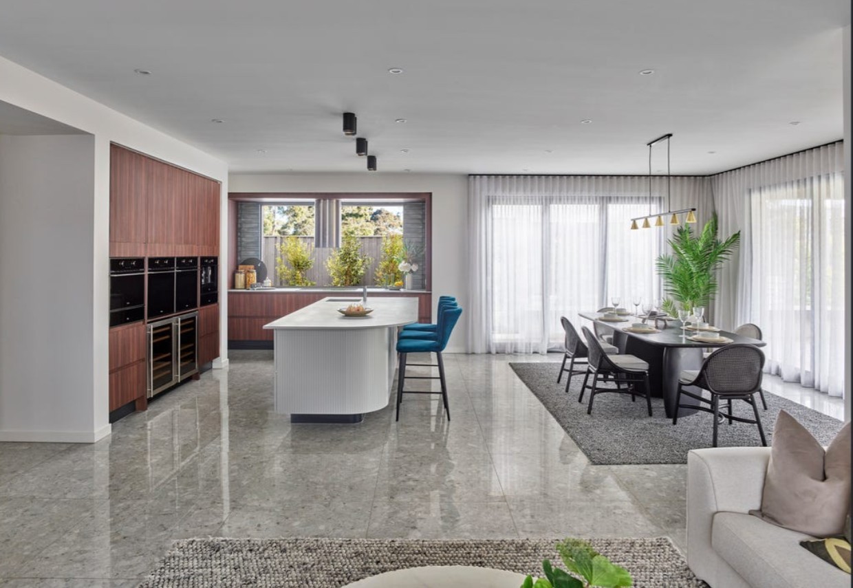 A grand staircase welcomes you inside, positioned opposite a private study-ideal for working from home-before leading into a vast open-plan living and dining area. At the heart of the home, the designer kitchen impresses with a striking curved island featuring a waterfall edge, complemented by a spacious butler's pantry.