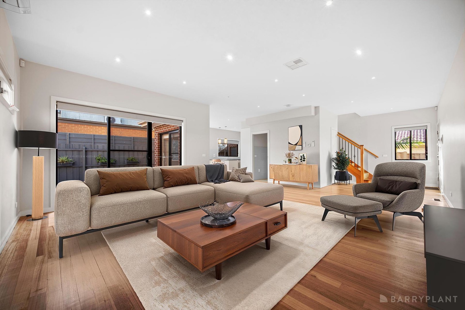 Step inside to find a large open-plan living and dining area flooded with natural light, complemented by a sleek kitchen featuring gas cooking, stainless steel appliances, and loads of storage.