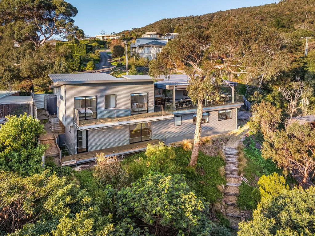 Savouring a breathtaking setting at the base of Arthurs Seat, this architectural home of five bedrooms delivers a mesmerising living experience amongst the treetops. With tranquil aspects stretching across the gully and out to Port Phillip Bay, the perfect property for large families or holiday-makers awaits with a serene sense.