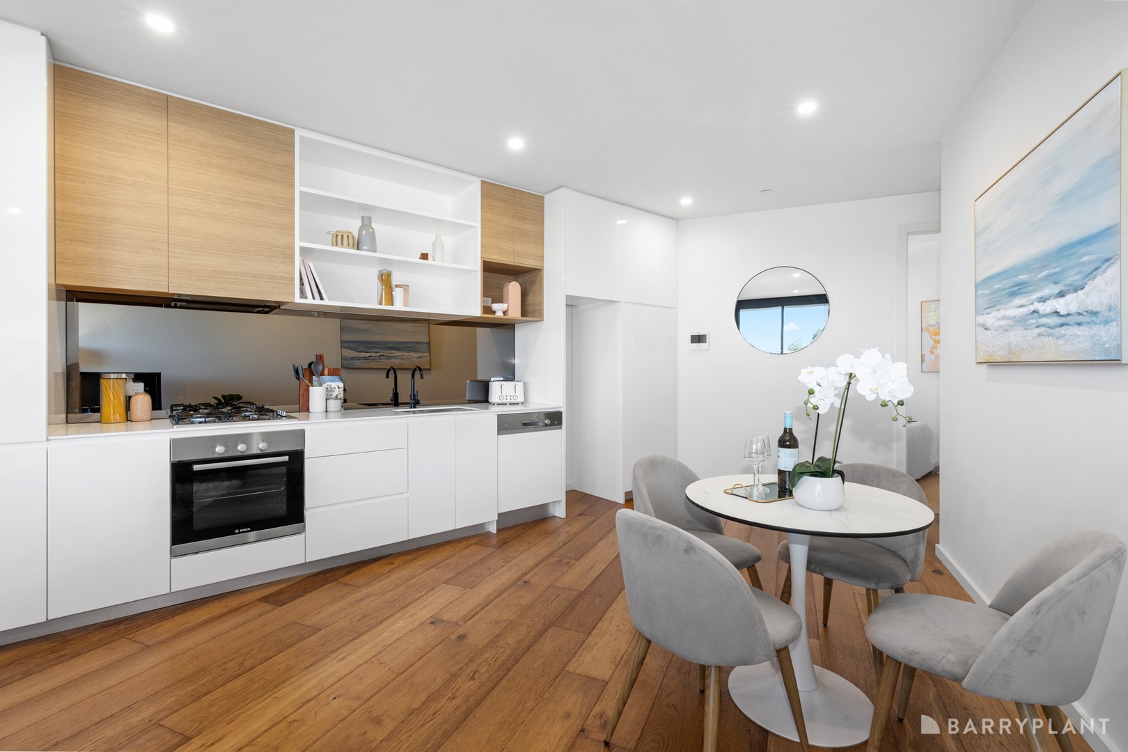 Enriched with sleek contemporary floorboards and high ceilings, the apartment's light filled interior embraces a stunning kitchen showcasing stone benches, mirrored splashbacks, Bosch appliances, semi-integrated Bosch dishwasher and soft-close cabinetry.