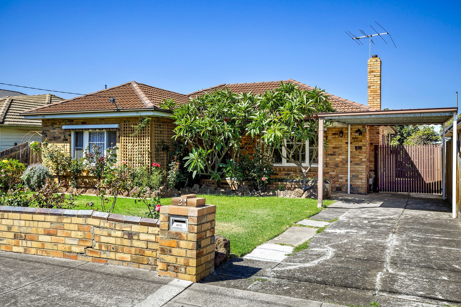 The existing property is a 1950s-era home built in the middle of large, established gardens. The welcoming front yard features rose bushes, lavender, and grand frangipani. Both the master bedroom and living room have North-facing windows that look out onto the garden. Through an open kitchen/meals area, you head onto a grand sunroom, where light streams in through windows.
