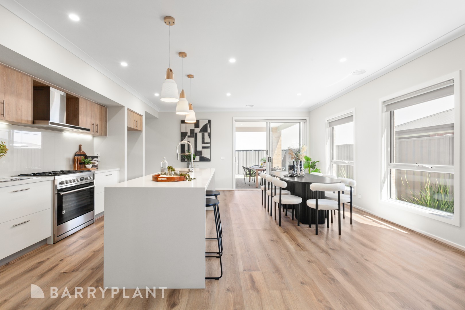 Entertainment is enhanced with dimmable LED lighting in the designated area, and the rest of the home is fitted with LED lighting, including subtle under-cabinet illumination. High-end touches like soft-close cabinetry, timber-look vinyl plank flooring, and Holland blinds throughout elevate the interiors. Outdoors, you'll find a fully equipped BBQ area with gas, water, and drainage, plus a timed irrigation system for front and rear landscaping. Safety and convenience are top priorities, with a Bosch alarm system, hard-wired doorbell, and aluminium lockable awning windows with mesh flyscreens.
