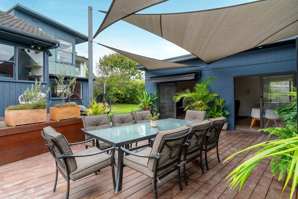 Embodying the essence of coastal living, the main residence delights with its inviting charm, sharing access to a spacious front garden and a secluded rear yard that beckons for leisurely afternoons. Inside, solid timber floors create a warm foundation, leading to an impressive lounge that serves as the heart of the home. Here, a solid wood heater radiates warmth, enhancing the atmosphere created by the exposed beams that stretch gracefully across the ceiling. The gabled roofline and strategically placed windows frame beautiful treed vistas, sharing the beauty of nature across an open dining space and an all-original kitchen. The three bedroom and two bathroom accommodation highlights a top floor retreat perfect for teenagers, and a master bedroom with renovated ensuite and private side balcony.