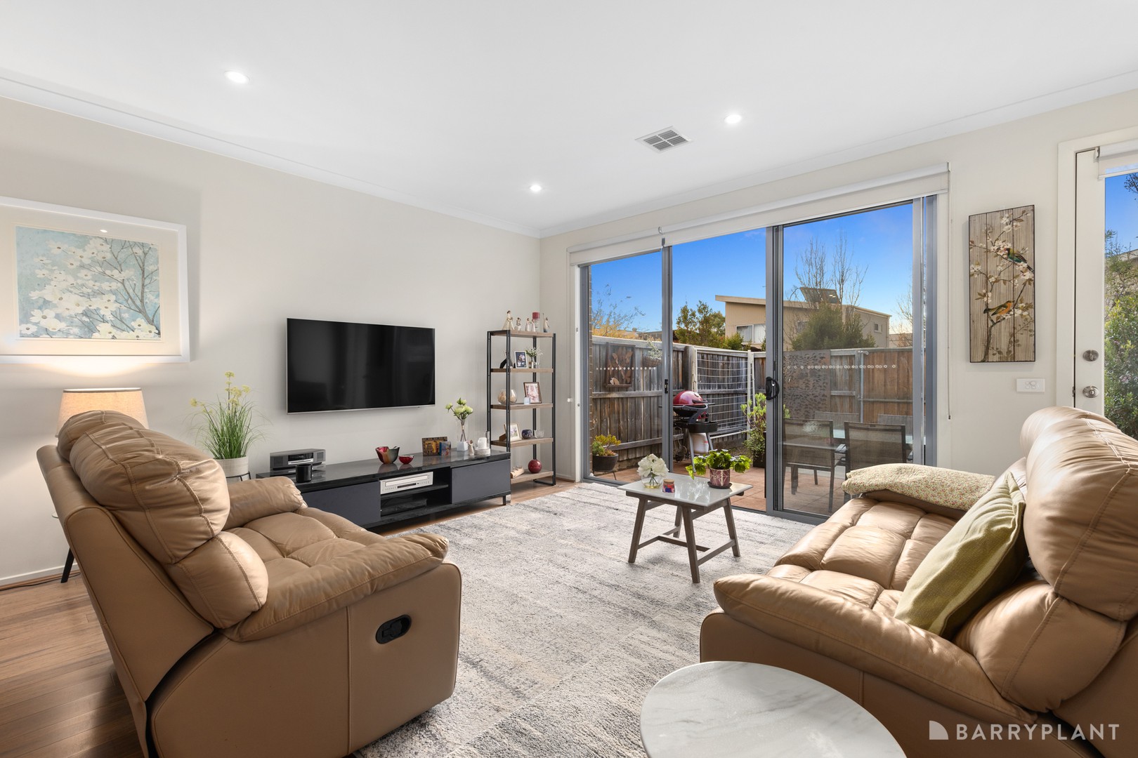 The private courtyard is bathed in northern sun and enhanced by an automated café-style awning for shaded entertaining, while a rear gate offers direct access to tranquil parkland with barbeque facilities. Throughout the home, quality appointments such as double roller blinds ensure both privacy and style.