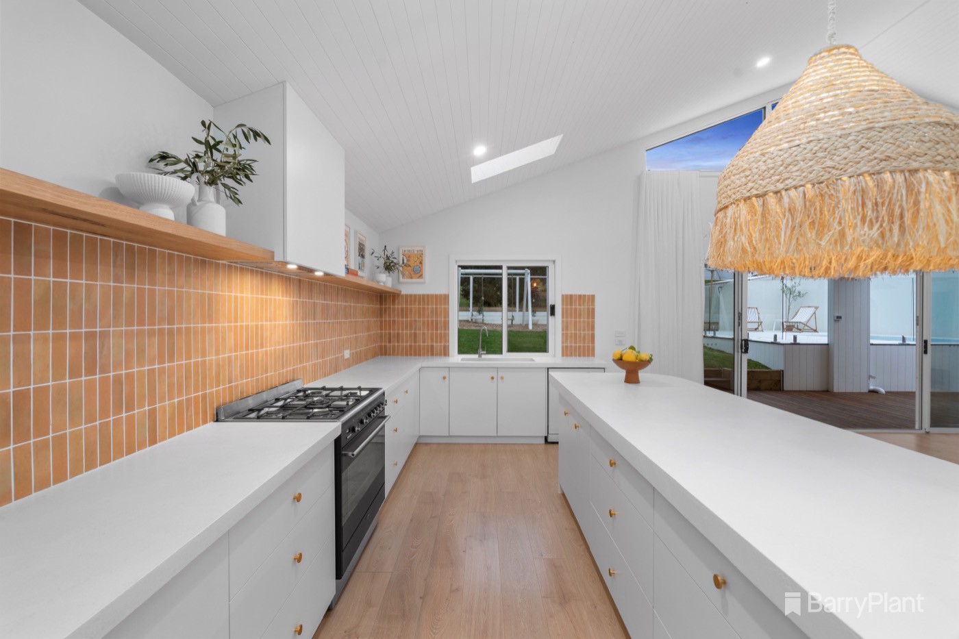 Sliding doors link the space with a covered entertaining deck that extends out to a low-maintenance backyard with swing set, in-ground pool and fabulous outdoor kitchen boasting a built-in bench, sink and Amalfi wood-fire pizza oven.