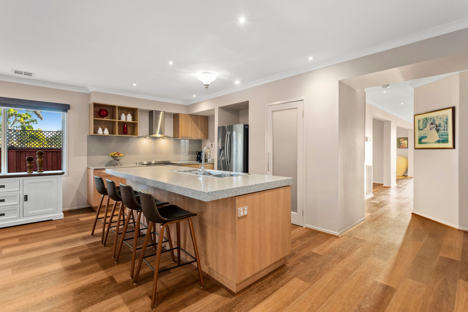 Made for practical and premium family living, you will also find a study/home office, ducted heating, evaporative cooling, 2 split systems, high ceilings, double garage with internal and drive through access, potential side access on south side of house, alarm and CCTV system, double glazed windows to the front and south sides, and separate laundry with external access.